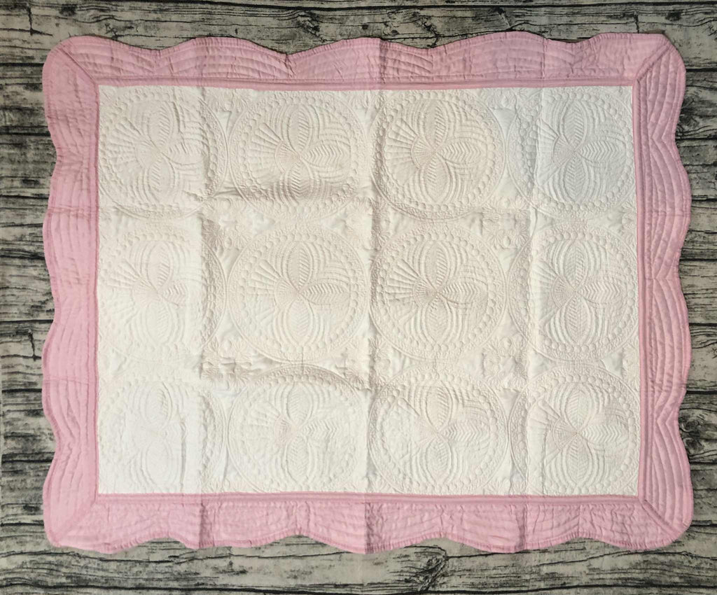 Heirloom Baby Quilt - White with Lt Pink Trim and Pink Stitching
